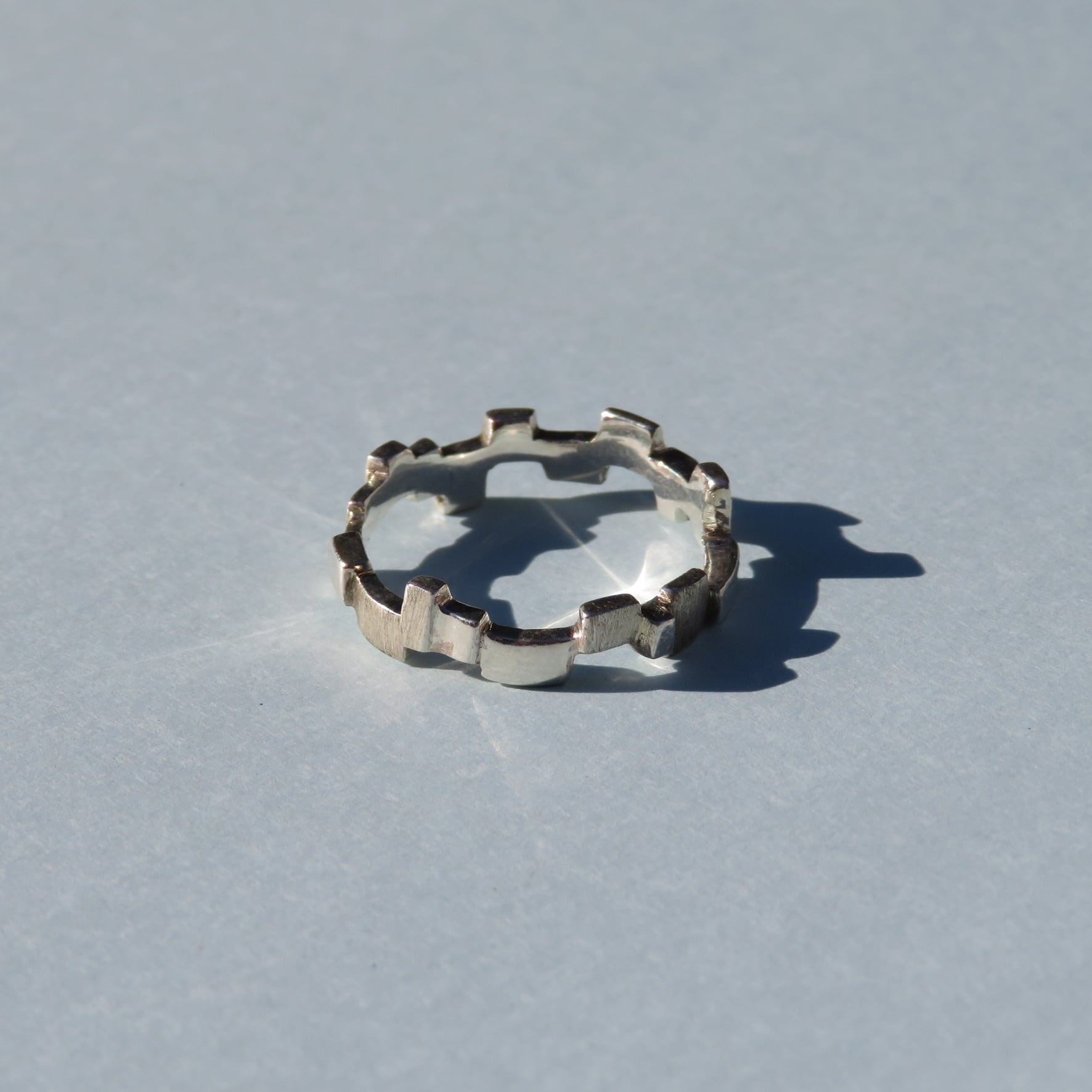ピカピカに磨いた鏡面とザラザラに仕上げた面のシルバー925のリングです。内側から丸みをつけて仕上げているので、着け心地は滑らかになります。