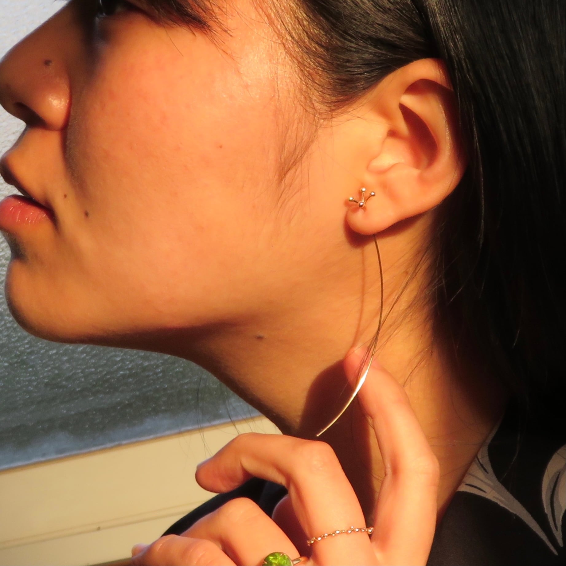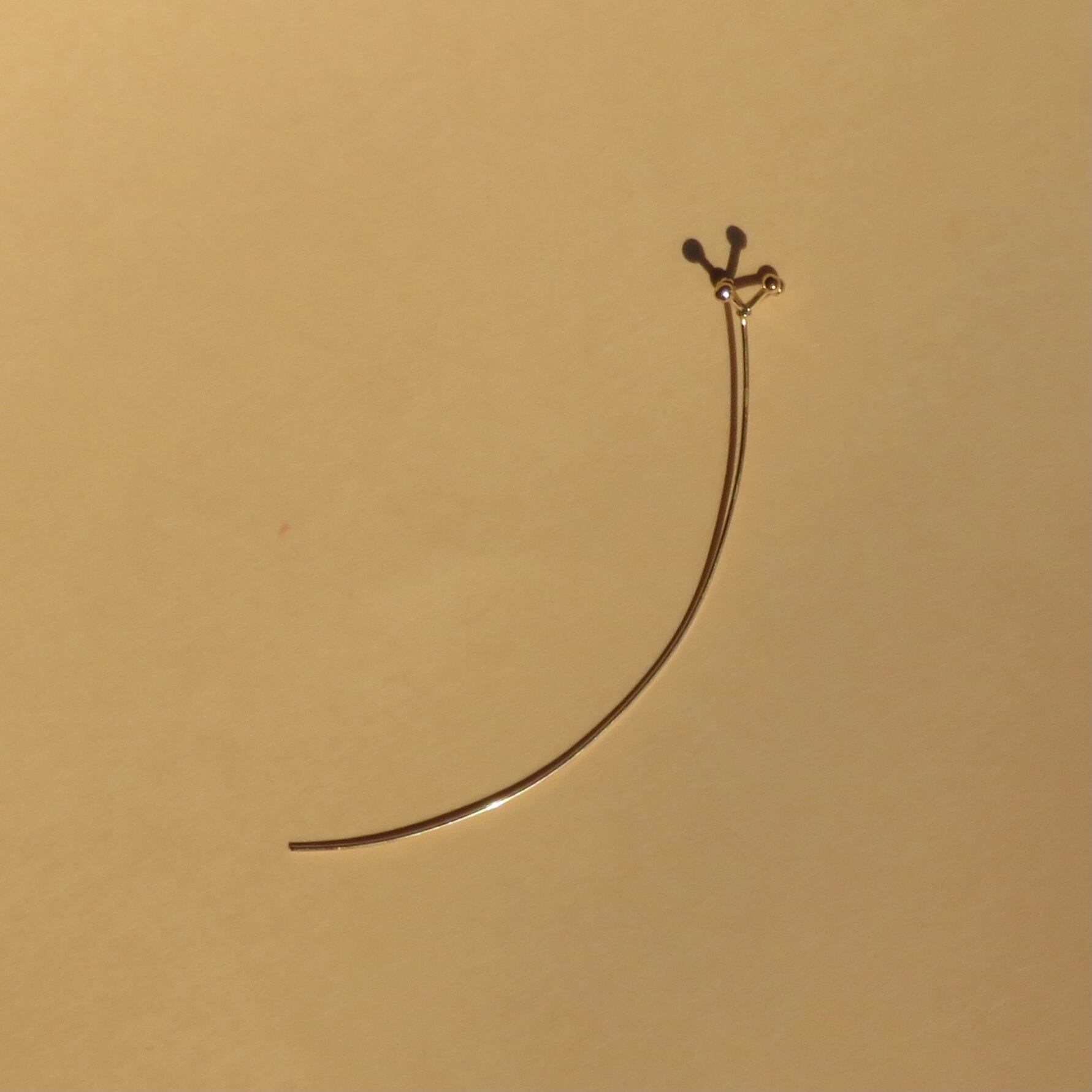 このピアスはミモザの花をイメージして作った、一輪挿しのように耳に通して着ける片耳用のピアスです。シルバー925と10金イエローゴールドの2色展開となっております。また、非常に繊細なデザインなので強度を保つ上で18金では柔らかくすぐにまがってしまうため、あえての10金で製作しました。