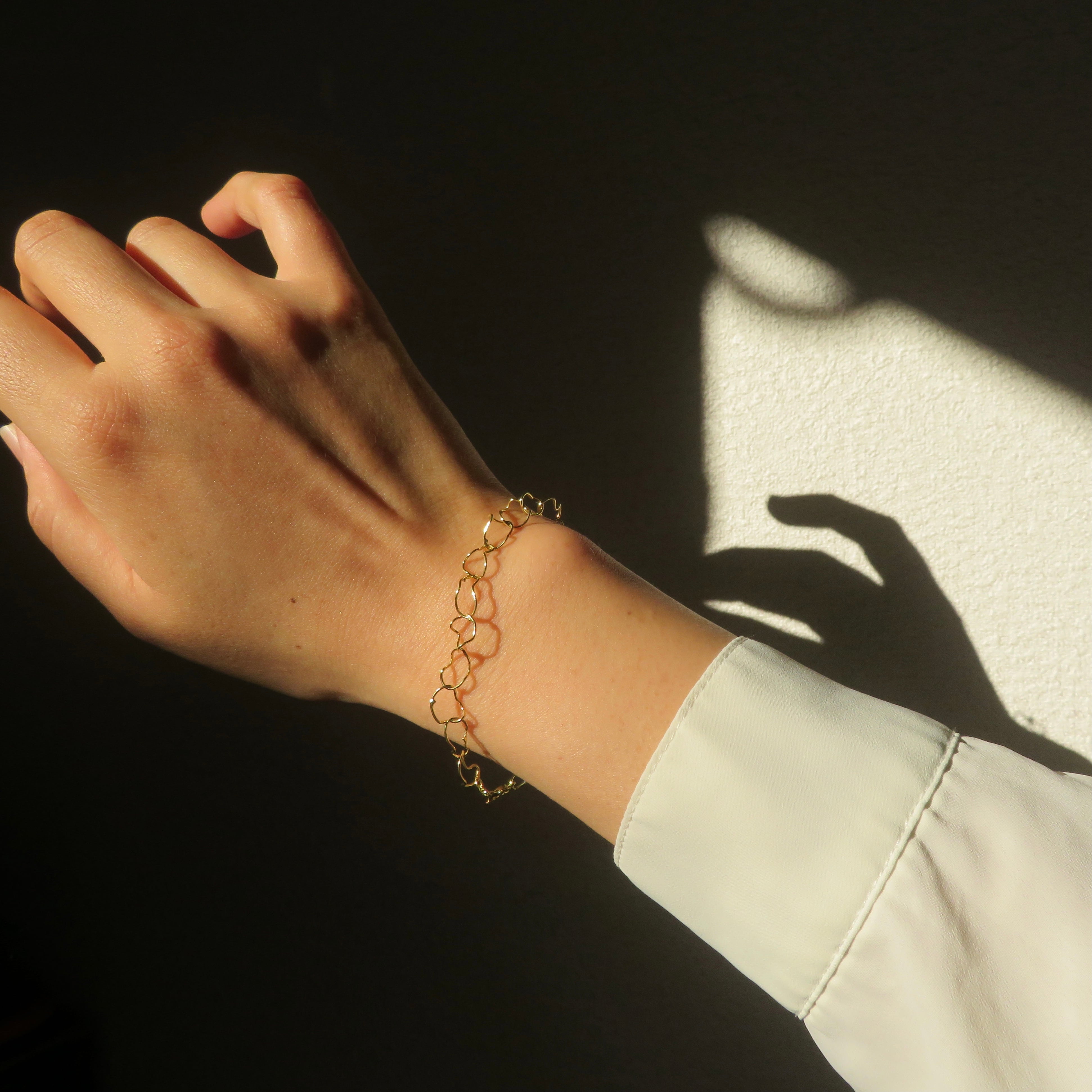 このブレスレットは全ての工程を手作業でチェーンを作っているので全てが一点物であり製作期間がかかります。しかしとても繊細で美しいアートピースなので、TPO関わらず楽しんでいただけるブレスレットです。